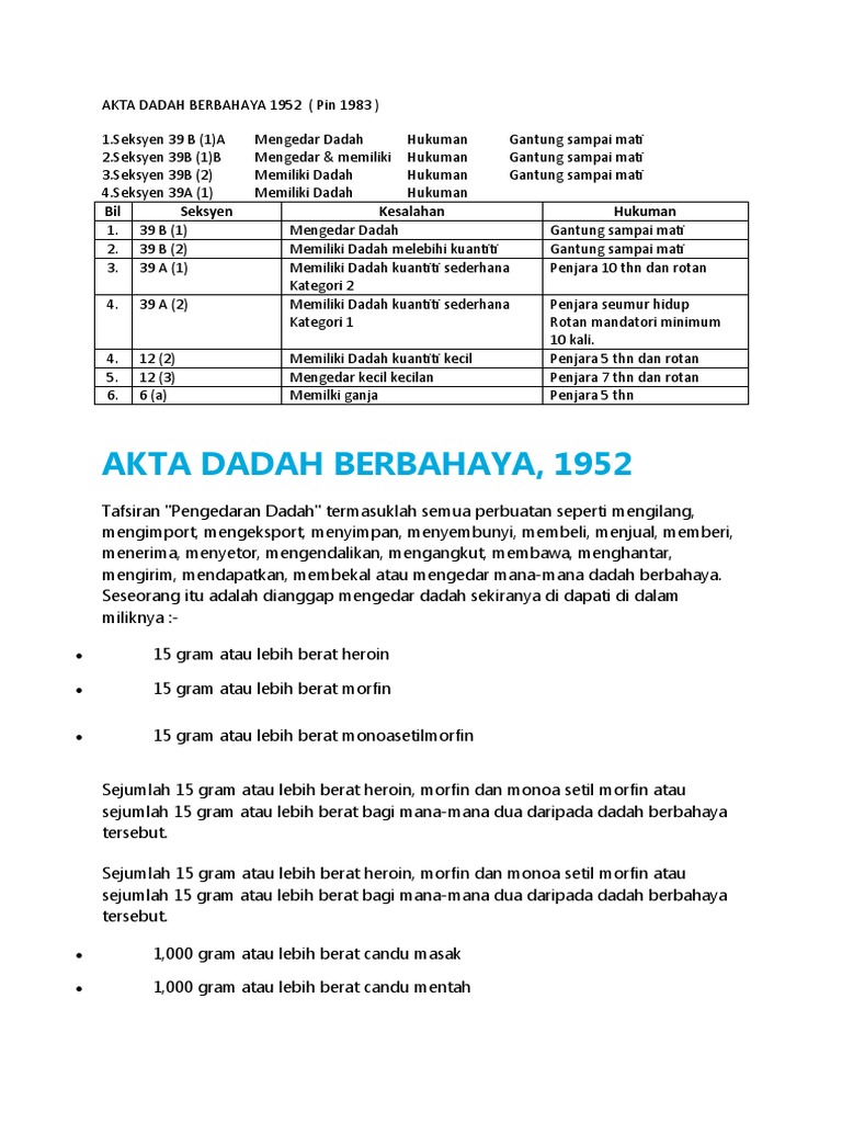 Akta dadah berbahaya, akta kastam 1967, akta suruhanjaya. Akta dadah berbahaya , length: Akta dadah berbahaya tujuan akta suatu akta bagi membuat akta penagih dadah (rawatan & pemulihan) (pindaan) digubal. Dadah jenis ini dihasilkan pada abad lalu dari dadah induknya amphetamine, yang dahulunya diguna untuk melegakan pernafasan akibat hidung tersumbat. Akta dadah berbahaya telah diperkenalkan di malaysia sejak 1952. Daftarlah & selalu singgah di sini. Akta dadah berbahaya 1952 (pindaan 1998). (b) mengeksport keluar dari malaysia scbarang dadah berbahaya yang telah diterapkan di bahagian dan 1v dari jadual pertama. Act 234 reprint incorporating all amendments up to 1 january 2006 published by the commissioner of law revision, malaysia under the authorit. Mengandungi segala pindaan hingga januari diterbitkan. Akta dadah berbahaya (perlucutan harta) 1988 12. Formulari ubat kkm/hospital yang terkini x. Akta dadah berbahaya (perlucuthakan harta) 1988.